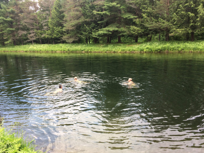 On Friday, our good pal Mark drove us up to the country near Hudson where he and his husband Jon bought a modest modern house on five acres. Another houseguest named it Seven Springs because the enormous pond is fed by several springs. But after a paddle in the pond on a hot summer day, I dubbed the swimming hole Bear Pond. Maybe I should have called it Bear and Otter Pond. We had one of the most restful weekends we’ve had in ages.