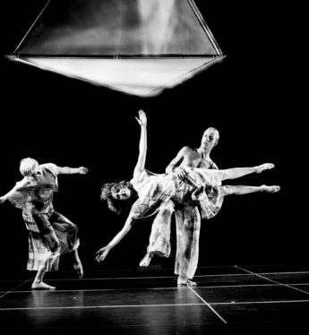 Trisha Brown. Set and Reset. 1983. With costumes and set element, Elastic Carrier (Shiner), by Rauschenberg. Flynn Theatre for the Performing Arts, Burlington, Vermont, February 1993. Image courtesy Trisha Brown Dance Company Archives, New York. Photo: Mark Hanauer